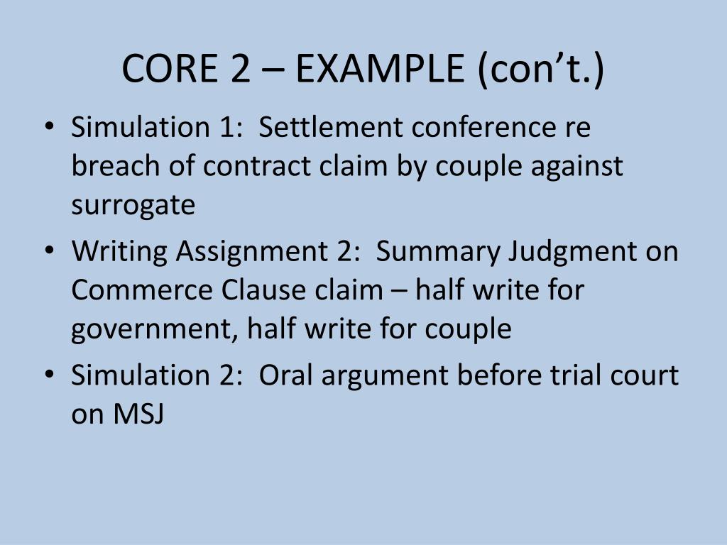 CORE 2 – EXAMPLE (con’t.) • Simulation 1: Settlement conference re breach of contract claim by couple against surrogate • Writing Assignment 2: Summary Judgment on Commerce Clause claim – half write for government, half write for couple • Simulation 2: Oral argument before trial court on MSJ
