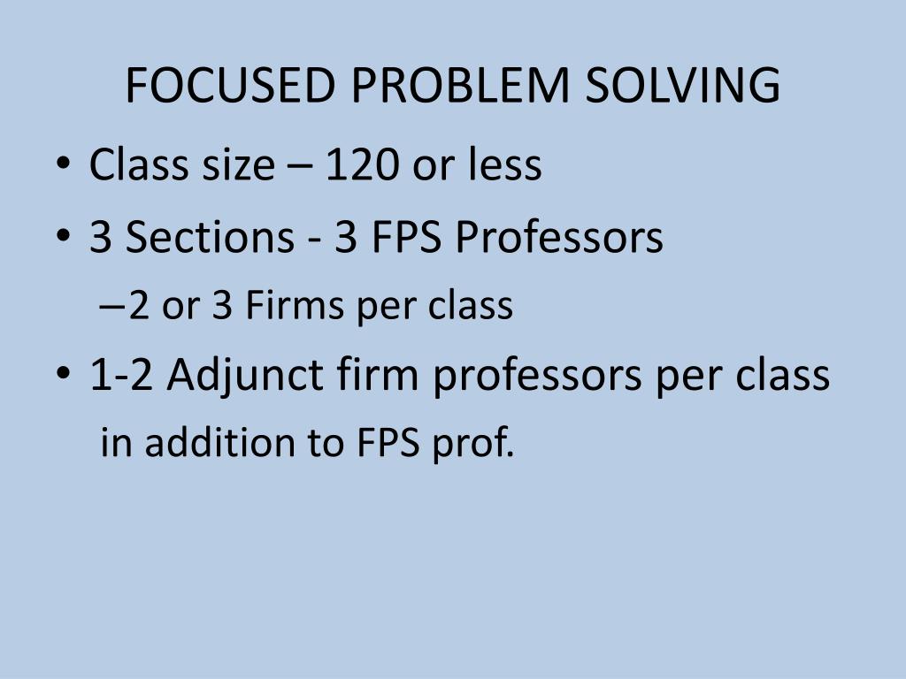 FOCUSED PROBLEM SOLVING • Class size – 120 or less • 3 Sections - 3 FPS Professors • 2 or 3 Firms per class • 1-2 Adjunct firm professors per class in addition to FPS prof.