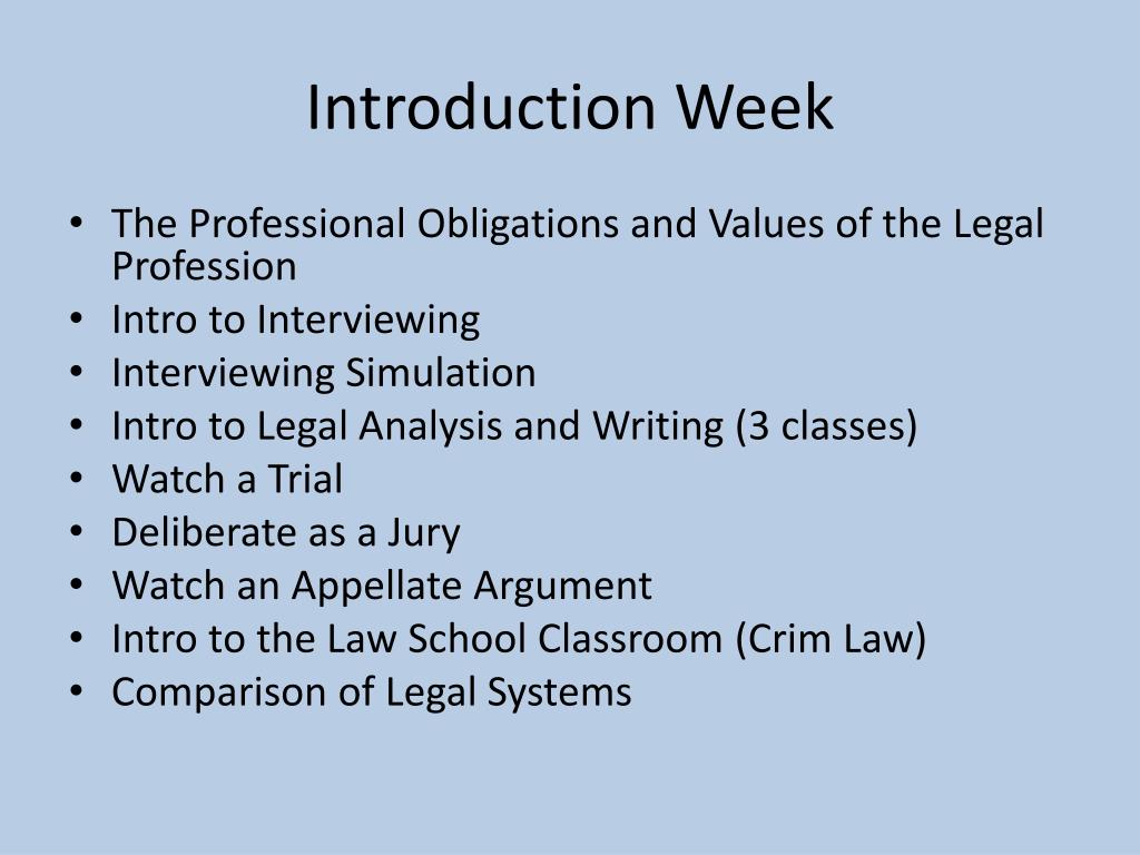 Introduction Week • The Professional Obligations and Values of the Legal Profession • Intro to Interviewing • Interviewing Simulation • Intro to Legal Analysis and Writing (3 classes) • Watch a Trial • Deliberate as a Jury • Watch an Appellate Argument • Intro to the Law School Classroom (Crim Law) • Comparison of Legal Systems