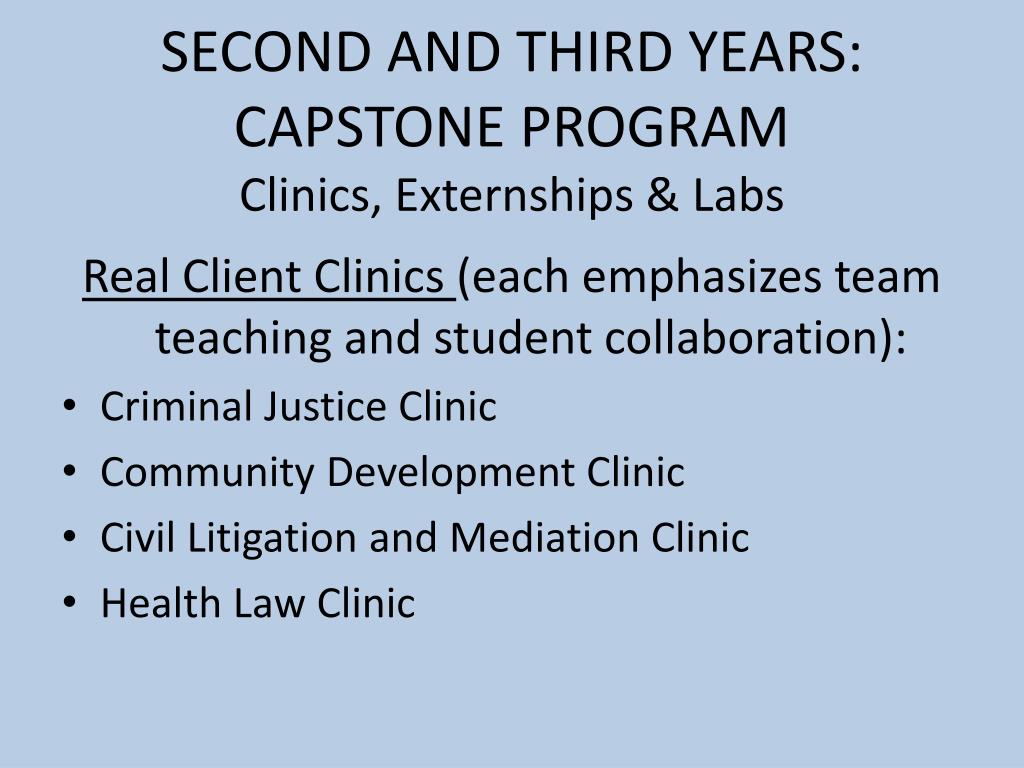 SECOND AND THIRD YEARS:CAPSTONE PROGRAMClinics, Externships & Labs Real Client Clinics (each emphasizes team teaching and student collaboration): • Criminal Justice Clinic • Community Development Clinic • Civil Litigation and Mediation Clinic • Health Law Clinic