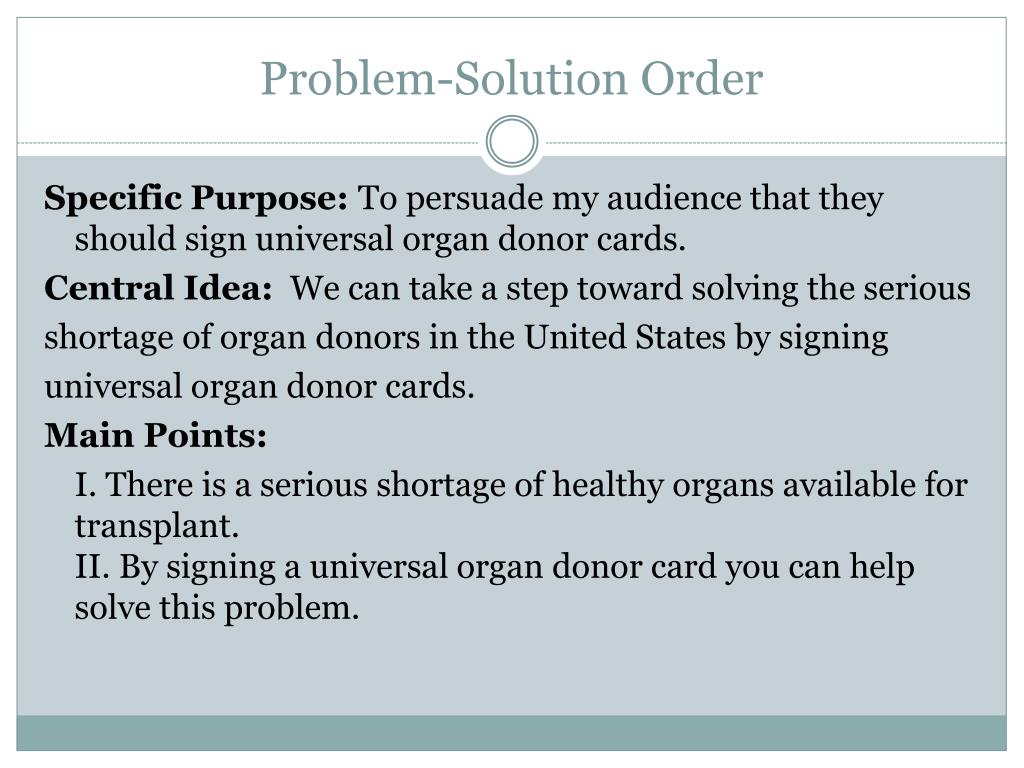 Problem-Solution Order Specific Purpose: To persuade my audience that they should sign universal organ donor cards. Central Idea: We can take a step toward solving the serious shortage of organ donors in the United States by signing universal organ donor cards. Main Points: I. There is a serious shortage of healthy organs available for transplant. II. By signing a universal organ donor card you can help solve this problem.