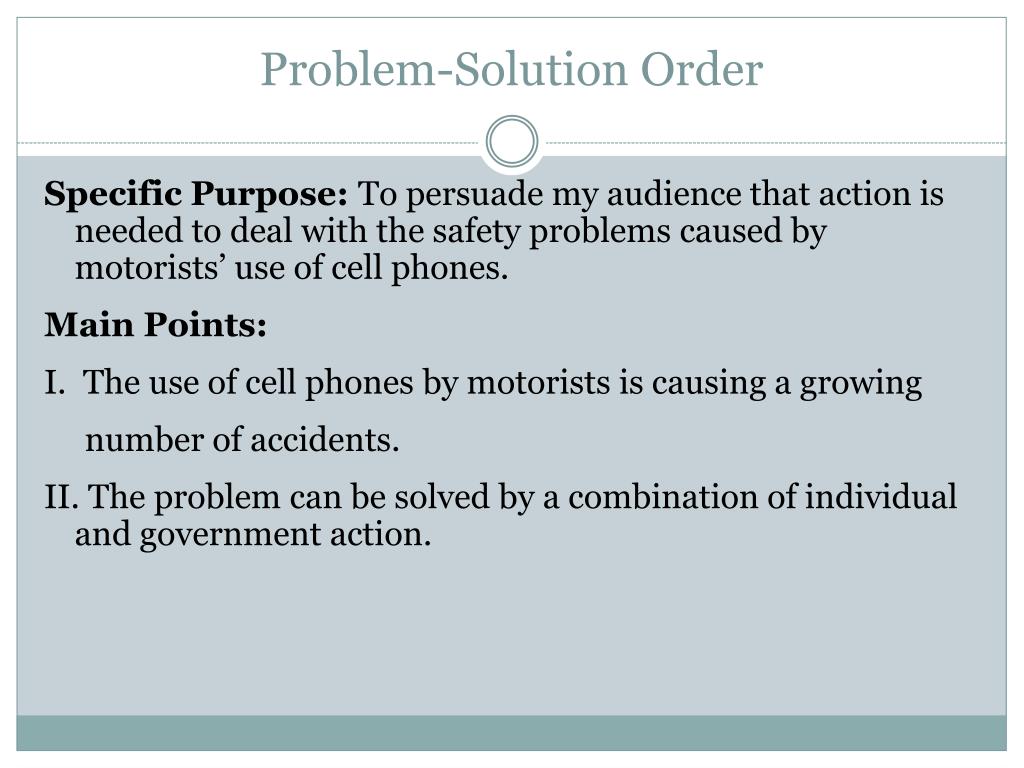 Problem-Solution Order Specific Purpose: To persuade my audience that action is needed to deal with the safety problems caused by motorists’ use of cell phones. Main Points: I. The use of cell phones by motorists is causing a growing number of accidents. II. The problem can be solved by a combination of individual and government action.