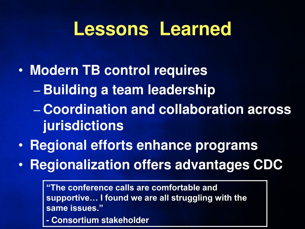 Lessons Learned • Modern TB control requires • Building a team leadership • Coordination and collaboration across jurisdictions • Regional efforts enhance programs • Regionalization offers advantages CDC