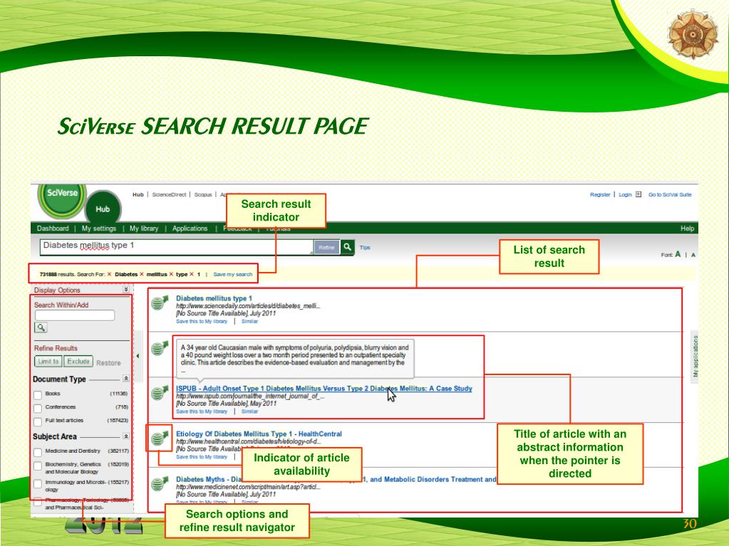 Search result indicator List of search result Title of article with an abstract information when the pointer is directed Indicator of article availability Search options and refine result navigator SciVerse SEARCH RESULT PAGE
