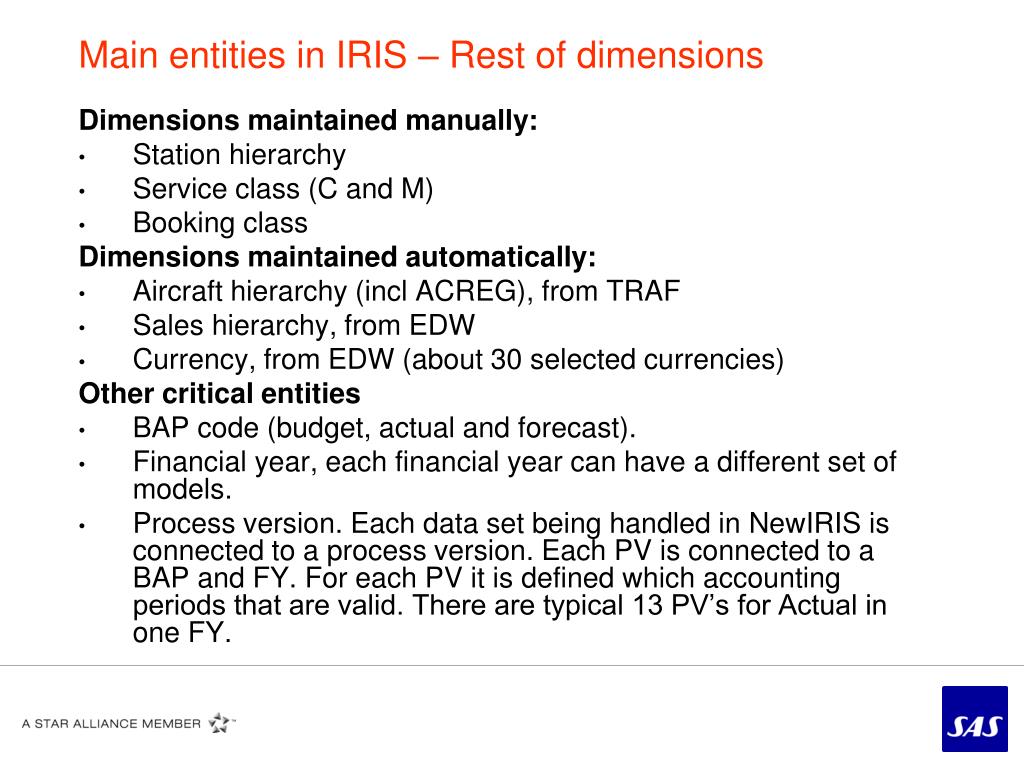 Main entities in IRIS – Rest of dimensions Dimensions maintained manually: • Station hierarchy • Service class (C and M) • Booking class Dimensions maintained automatically: • Aircraft hierarchy (incl ACREG), from TRAF • Sales hierarchy, from EDW • Currency, from EDW (about 30 selected currencies) Other critical entities • BAP code (budget, actual and forecast). • Financial year, each financial year can have a different set of models. • Process version. Each data set being handled in NewIRIS is connected to a process version. Each PV is connected to a BAP and FY. For each PV it is defined which accounting periods that are valid. There are typical 13 PV’s for Actual in one FY.