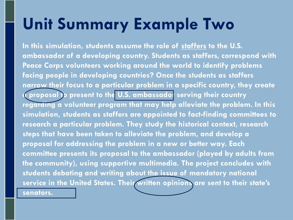 Unit Summary Example Two In this simulation, students assume the role of staffers to the U.S. ambassador of a developing country. Students as staffers, correspond with Peace Corps volunteers working around the world to identify problems facing people in developing countries? Once the students as staffers narrow their focus to a particular problem in a specific country, they create a proposal to present to the U.S. ambassador serving their country regarding a volunteer program that may help alleviate the problem. In this simulation, students as staffers are appointed to fact-finding committees to research a particular problem. They study the historical context, research steps that have been taken to alleviate the problem, and develop a proposal for addressing the problem in a new or better way. Each committee presents its proposal to the ambassador (played by adults from the community), using supportive multimedia. The project concludes with students debating and writing about the issue of mandatory national service in the United States. Their written opinions are sent to their state’s senators.
