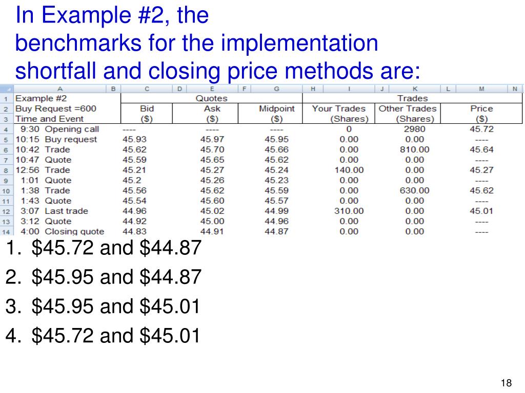 In Example #2, the benchmarks for the implementation shortfall and closing price methods are: • $45.72 and $44.87 • $45.95 and $44.87 • $45.95 and $45.01 • $45.72 and $45.01