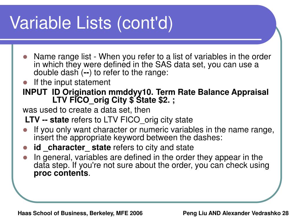 Variable Lists • SAS provides several different types of variable lists, which can be used in all procedures, and in some data step statements. • Numbered List - When a set of variables have the same prefix, and the rest of the name is a consecutive set of numbers, you can use a single dash (-) to refer to an entire range: x1 - x3 for x1, x2, x3; x01 - x03 for x01, x02, x03 • Colon list - When a set of variables all begin with the same sequence of characters you can place a colon after the sequence to include them all. If variables a, b, xheight, and xwidth have been defined, then x: for xwidth, xheight. • Special Lists - Three keywords refer to a list with the obvious meaning: _numeric_ , _character_, _all_ In a data step, special lists will only refer to variables which were already defined when the list is encountered. Haas School of Business, Berkeley, MFE 2006Peng Liu AND Alexander Vedrashko 27