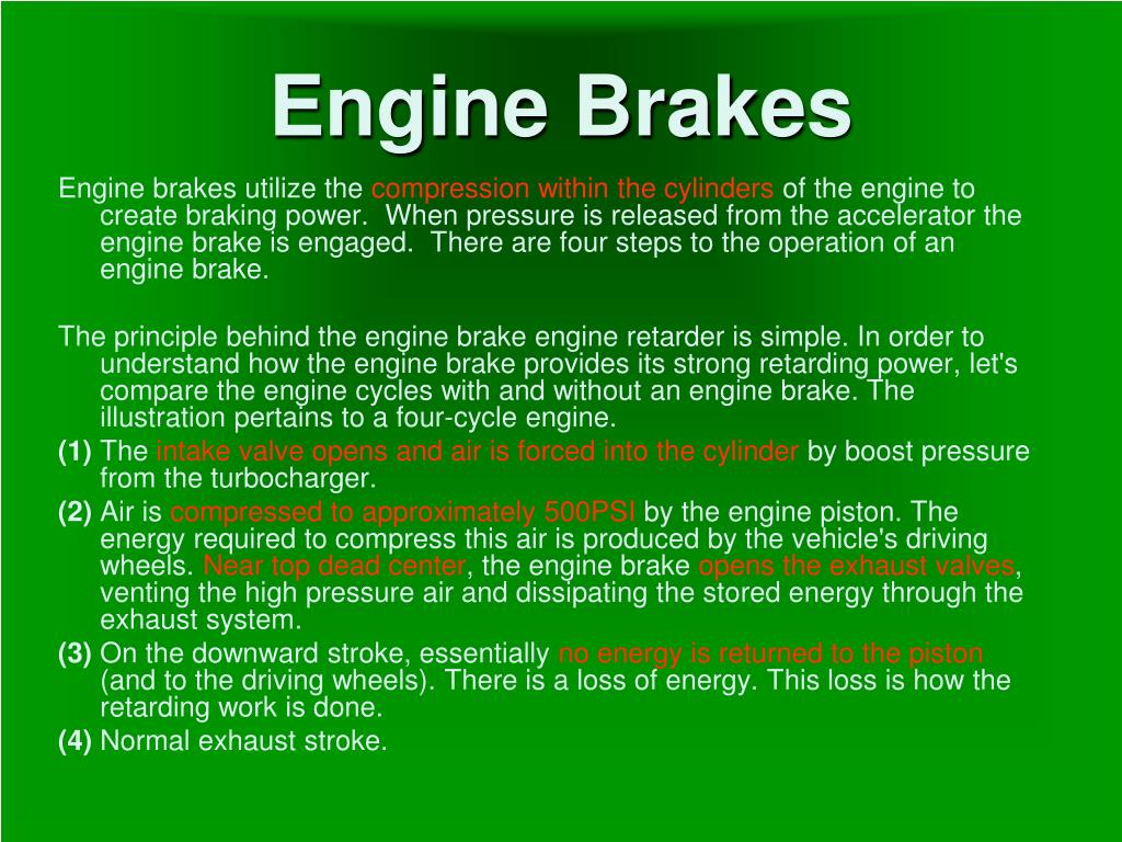 Engine Brakes Engine brakes utilize the compression within the cylinders of the engine to create braking power. When pressure is released from the accelerator the engine brake is engaged. There are four steps to the operation of an engine brake. The principle behind the engine brake engine retarder is simple. In order to understand how the engine brake provides its strong retarding power, let's compare the engine cycles with and without an engine brake. The illustration pertains to a four-cycle engine. (1) The intake valve opens and air is forced into the cylinder by boost pressure from the turbocharger. (2) Air is compressed to approximately 500PSI by the engine piston. The energy required to compress this air is produced by the vehicle's driving wheels. Near top dead center, the engine brake opens the exhaust valves, venting the high pressure air and dissipating the stored energy through the exhaust system. (3) On the downward stroke, essentially no energy is returned to the piston (and to the driving wheels). There is a loss of energy. This loss is how the retarding work is done. (4) Normal exhaust stroke.