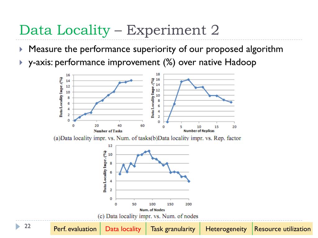 Data Locality – Experiment 2 • Measure the performance superiority of our proposed algorithm • y-axis: performance improvement (%) over native Hadoop
