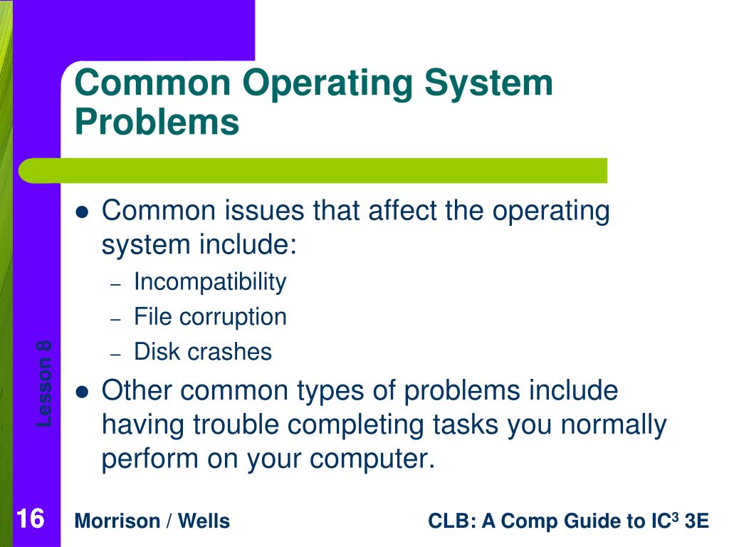 Lesson 8 Operating Systems. Computer Literacy BASICS: A Comprehensive Guide to IC 3 , 3 rd Edition. Morrison / Wells. Objectives. Identify the purpose of an operating system. Identify different operating systems. Describe computer user interaction with multiple operating systems.