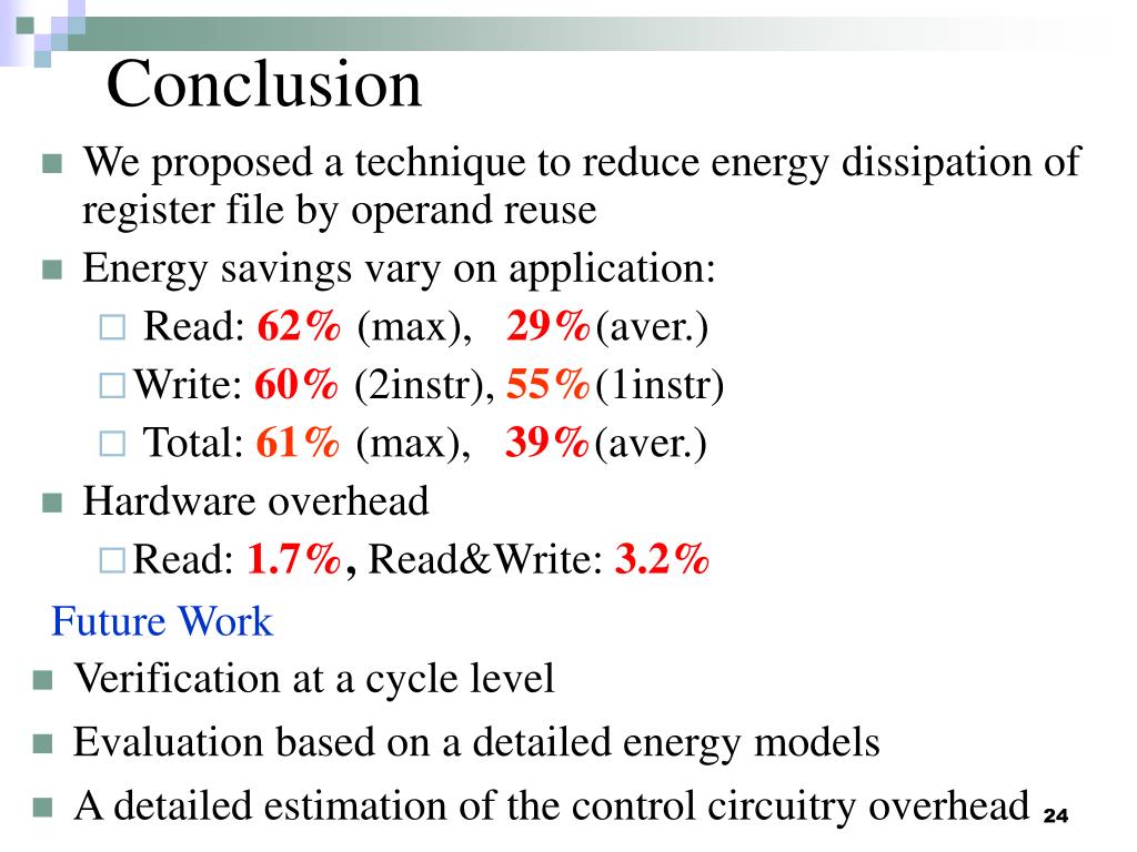 Conclusion • We proposed a technique to reduce energy dissipation of register file by operand reuse • Energy savings vary on application: • Read: 62% (max), 29%(aver.) • Write: 60% (2instr), 55%(1instr) • Total: 61% (max), 39%(aver.) • Hardware overhead • Read: 1.7%, Read&Write: 3.2% Future Work • Verification at a cycle level • Evaluation based on a detailed energy models • A detailed estimation of the control circuitry overhead