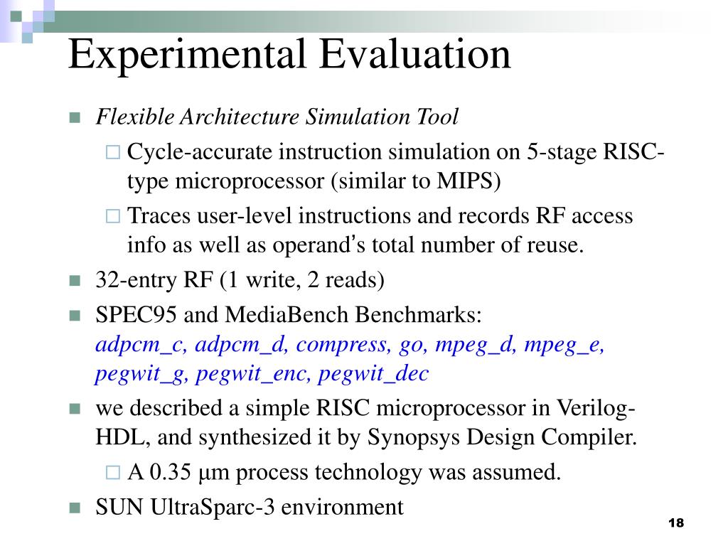 Experimental Evaluation • Flexible Architecture Simulation Tool • Cycle-accurate instruction simulation on 5-stage RISC-type microprocessor (similar to MIPS) • Traces user-level instructions and records RF access info as well as operand’s total number of reuse. • 32-entry RF (1 write, 2 reads) • SPEC95 and MediaBench Benchmarks: adpcm_c, adpcm_d, compress, go, mpeg_d, mpeg_e, pegwit_g, pegwit_enc, pegwit_dec • we described a simple RISC microprocessor in Verilog-HDL, and synthesized it by Synopsys Design Compiler. • A 0.35 μm process technology was assumed. • SUN UltraSparc-3 environment