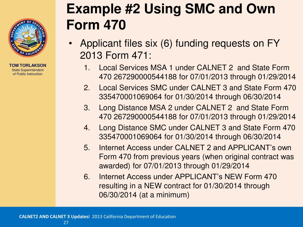 Example #1 Using SMC Alone Applicant files four (4) funding requests on FY 2013 Form 471: Local Services MSA 1 under CALNET 2 and State Form 470 267290000544188 for 07/01/2013 through 01/29/2014 Local Services SMC under CALNET 3 and State Form 470 335470001069064 for 01/30/2014 through 06/30/2014 Long Distance MSA 2 under CALNET 2 and State Form 470 267290000544188 for 07/01/2013 through 01/29/2014 Long Distance SMC under CALNET 3 and State Form 470 335470001069064 for 01/30/2014 through 06/30/2014 Monthly recurring charges must be based on CALNET 2 rates