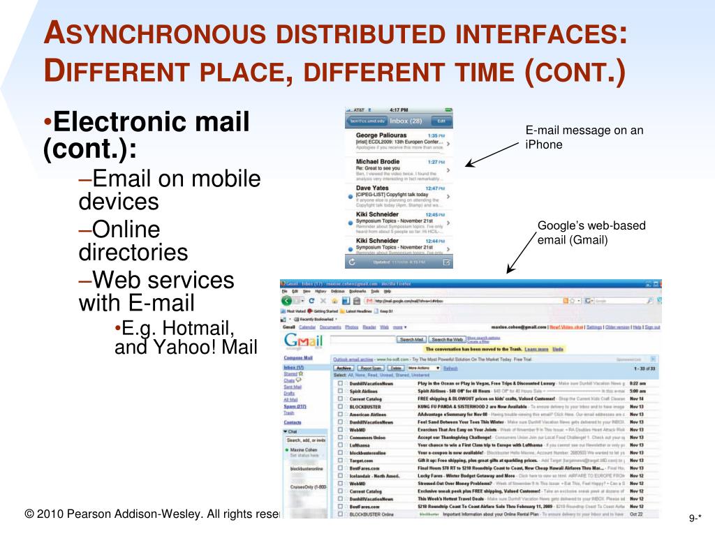 E-mail message on an iPhone Google’s web-based email (Gmail) Electronic mail (cont.): Email on mobile devices Online directories Web services with E-mail E.g. Hotmail, and Yahoo! Mail Asynchronous distributed interfaces: Different place, different time (cont.) 9-*