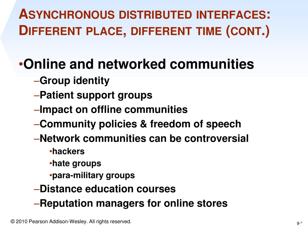 Online and networked communities Group identity Patient support groups Impact on offline communities Community policies & freedom of speech Network communities can be controversial hackers hate groups para-military groups Distance education courses Reputation managers for online stores Asynchronous distributed interfaces: Different place, different time (cont.) 9-*