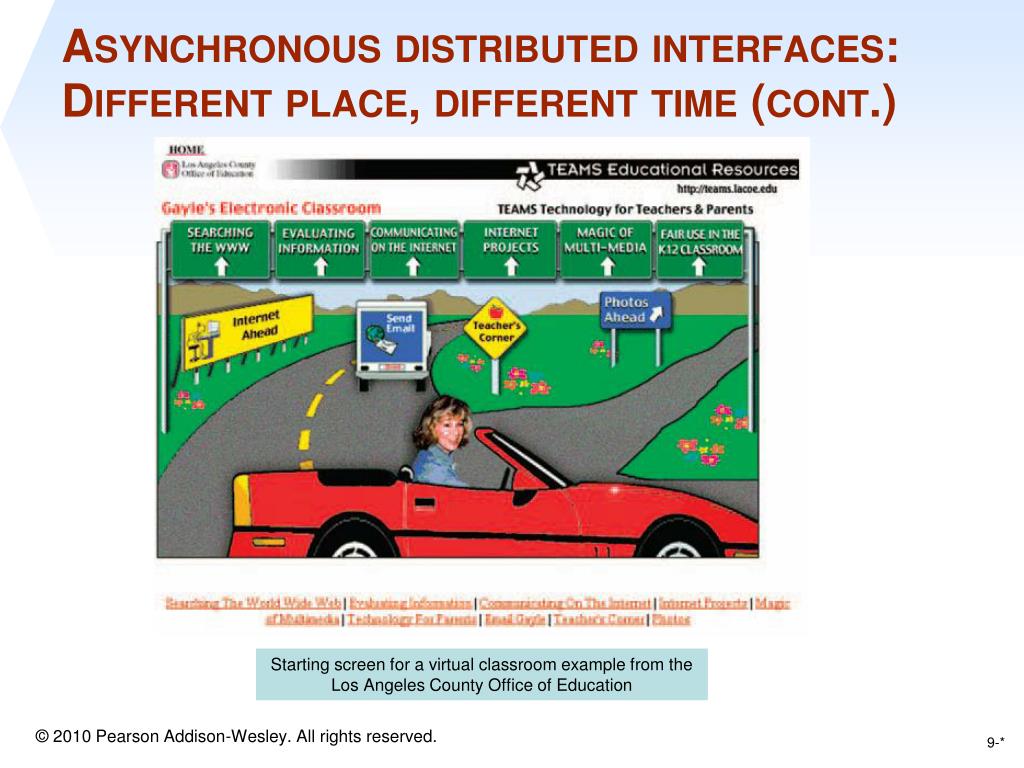 Asynchronous distributed interfaces: Different place, different time (cont.) Starting screen for a virtual classroom example from the Los Angeles County Office of Education 9-*
