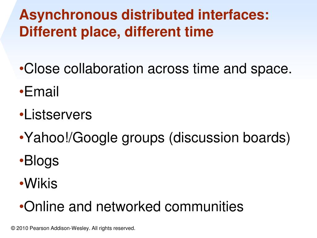 Asynchronous distributed interfaces: Different place, different time •Close collaboration across time and space. •Email •Listservers •Yahoo!/Google groups (discussion boards) •Blogs •Wikis •Online and networked communities