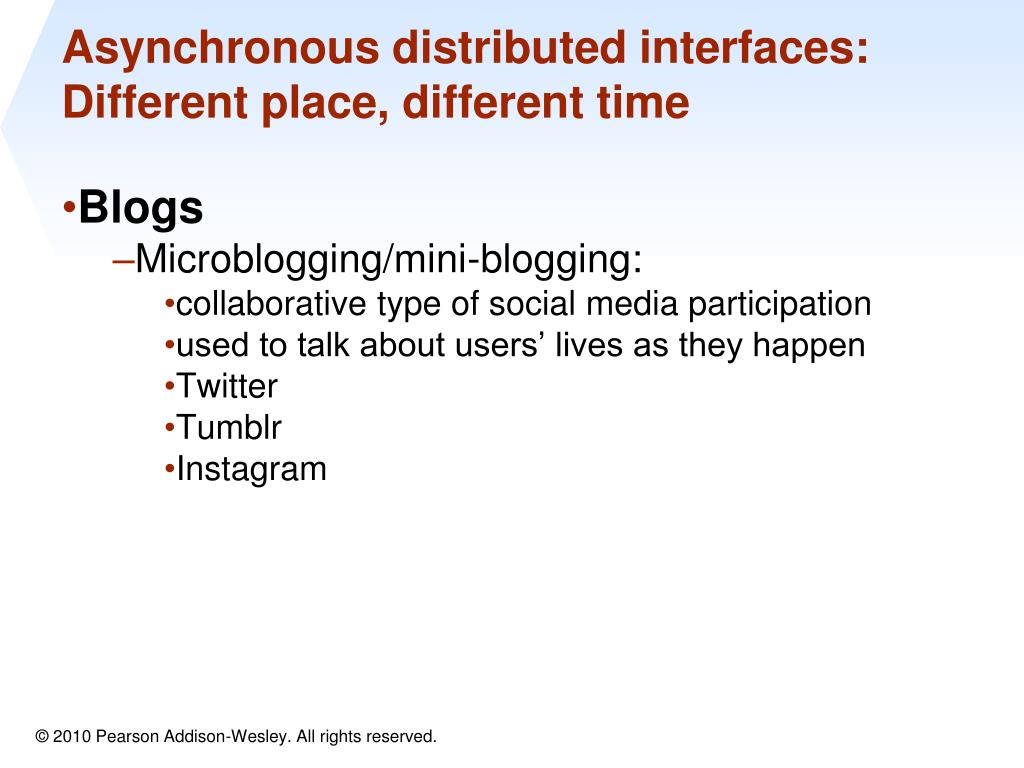 Asynchronous distributed interfaces: Different place, different time •Blogs –Microblogging/mini-blogging: •collaborative type of social media participation •used to talk about users’ lives as they happen •Twitter •Tumblr •Instagram