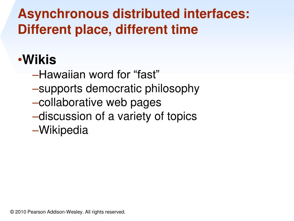 Asynchronous distributed interfaces: Different place, different time •Wikis –Hawaiian word for “fast” –supports democratic philosophy –collaborative web pages –discussion of a variety of topics –Wikipedia