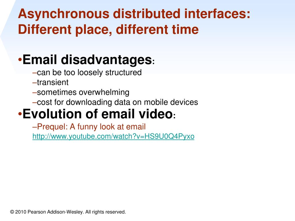 Asynchronous distributed interfaces: Different place, different time •Email disadvantages: –can be too loosely structured –transient –sometimes overwhelming –cost for downloading data on mobile devices •Evolution of email video: –Prequel: A funny look at email http://www.youtube.com/watch?v=HS9U0Q4Pyxo