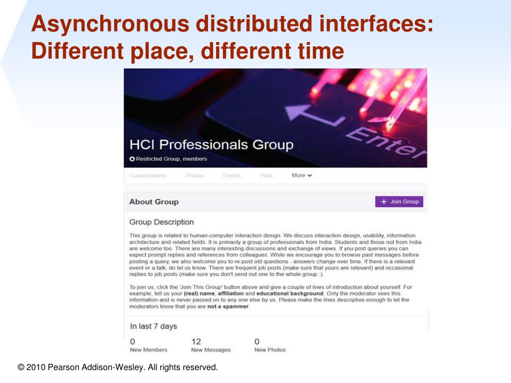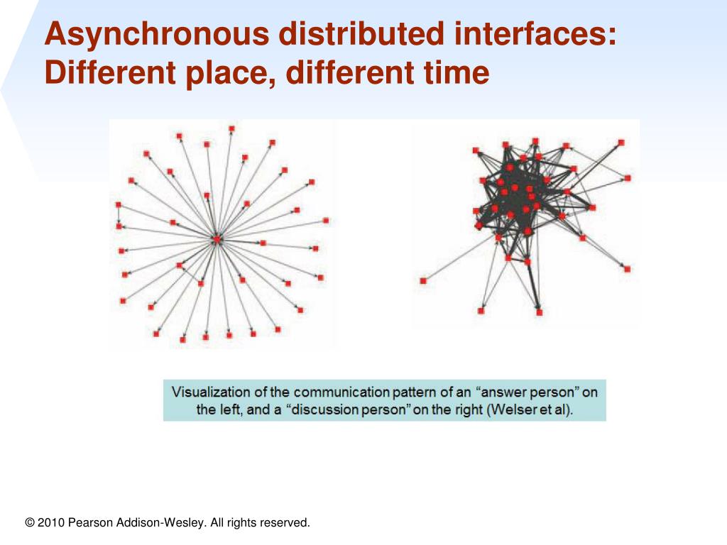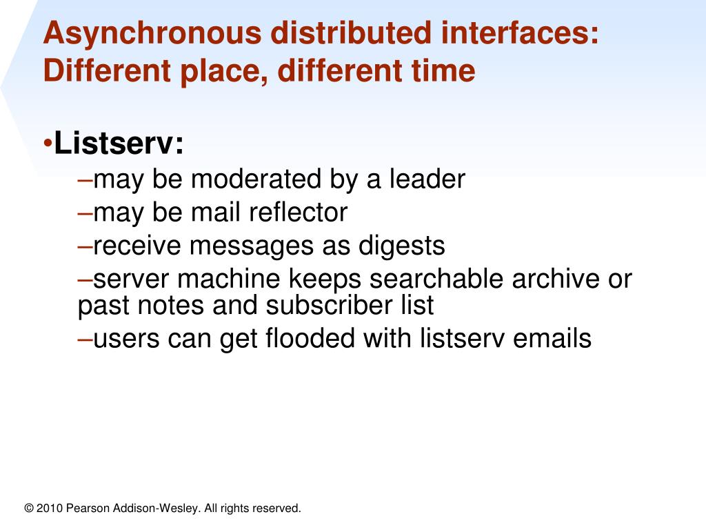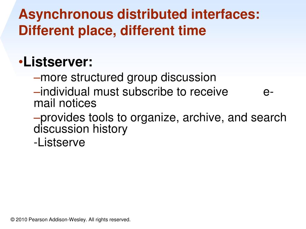 Asynchronous distributed interfaces: Different place, different time •Listserver: –more structured group discussion –individual must subscribe to receive e-mail notices –provides tools to organize, archive, and search discussion history -Listserve