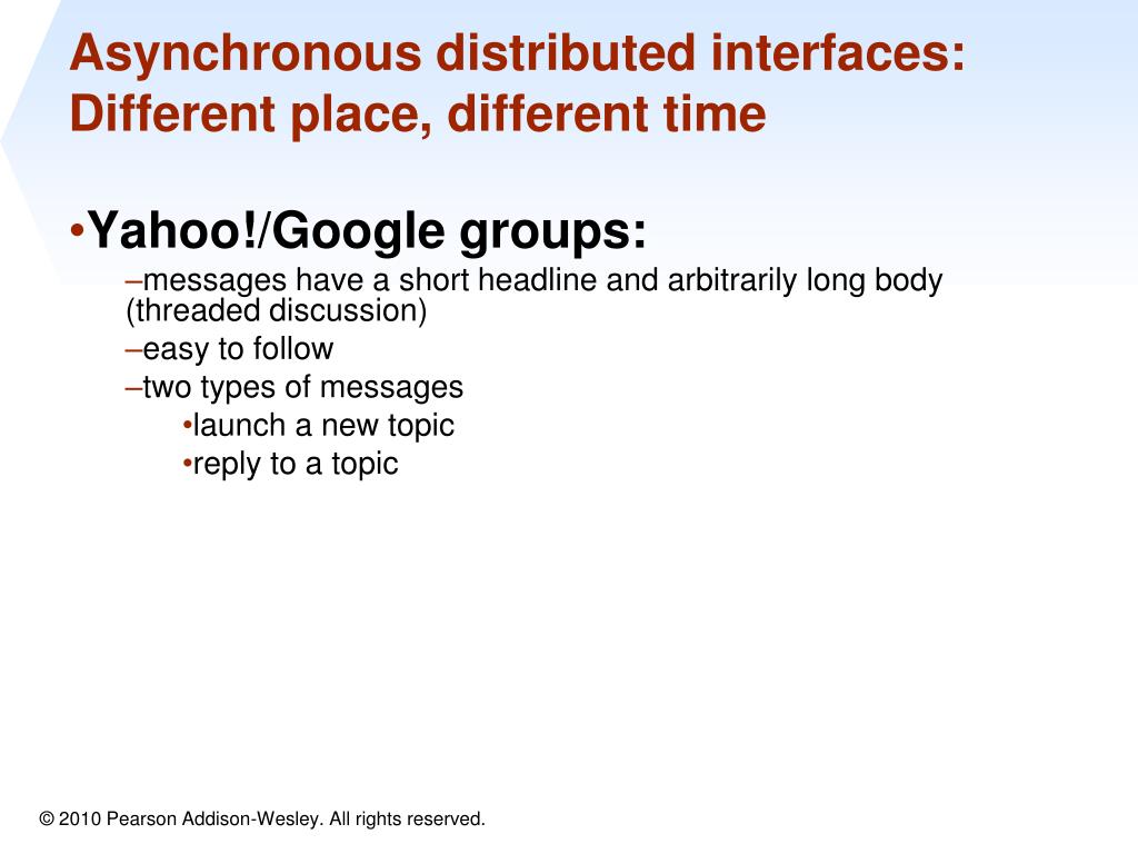 Asynchronous distributed interfaces: Different place, different time •Yahoo!/Google groups: –messages have a short headline and arbitrarily long body (threaded discussion) –easy to follow –two types of messages •launch a new topic •reply to a topic