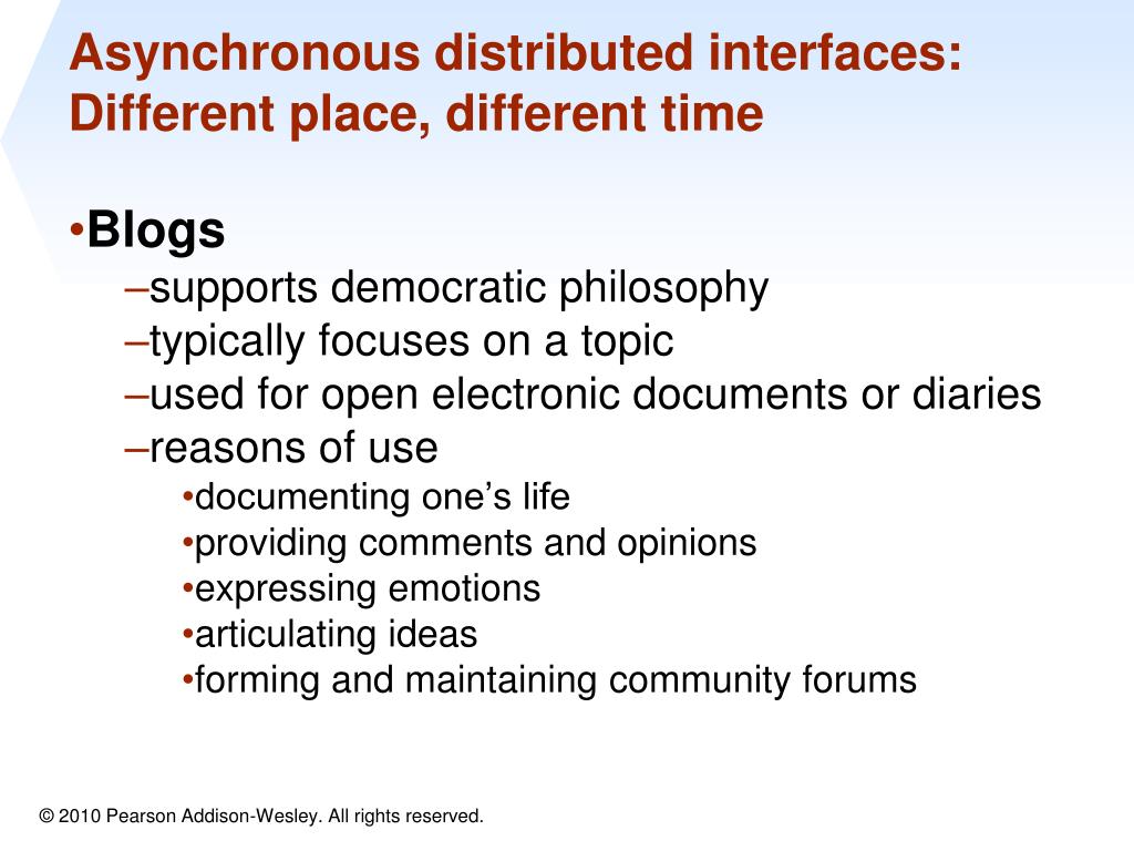 Asynchronous distributed interfaces: Different place, different time •Blogs –supports democratic philosophy –typically focuses on a topic –used for open electronic documents or diaries –reasons of use •documenting one’s life •providing comments and opinions •expressing emotions •articulating ideas •forming and maintaining community forums