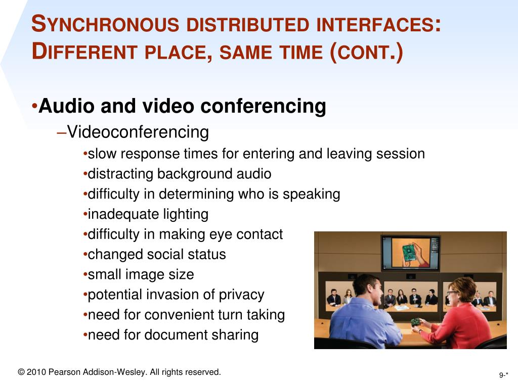 Audio and video conferencing Videoconferencing slow response times for entering and leaving session distracting background audio difficulty in determining who is speaking inadequate lighting difficulty in making eye contact changed social status small image size potential invasion of privacy need for convenient turn taking need for document sharing Synchronous distributed interfaces:Different place, same time (cont.) 9-*