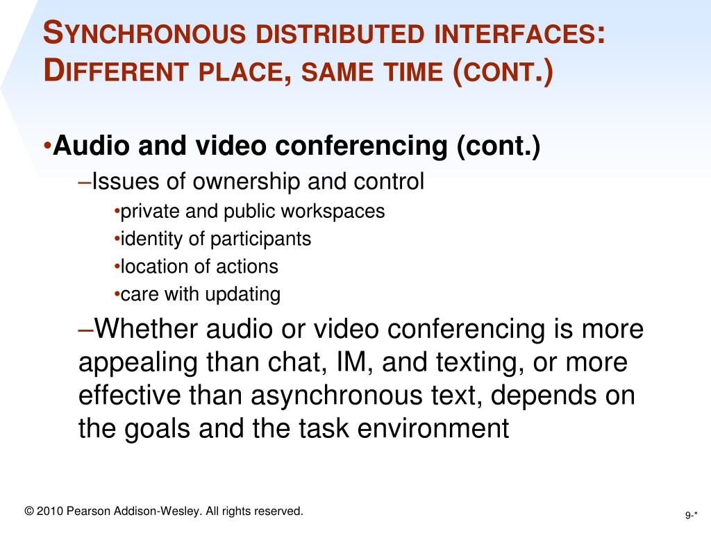 Audio and video conferencing (cont.) Issues of ownership and control private and public workspaces identity of participants location of actions care with updating Whether audio or video conferencing is more appealing than chat, IM, and texting, or more effective than asynchronous text, depends on the goals and the task environment Synchronous distributed interfaces:Different place, same time (cont.) 9-*