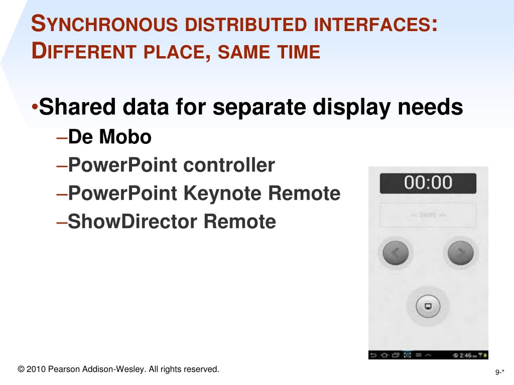 Shared data for separate display needs De Mobo PowerPoint controller PowerPoint Keynote Remote ShowDirector Remote Synchronous distributed interfaces:Different place, same time 9-*