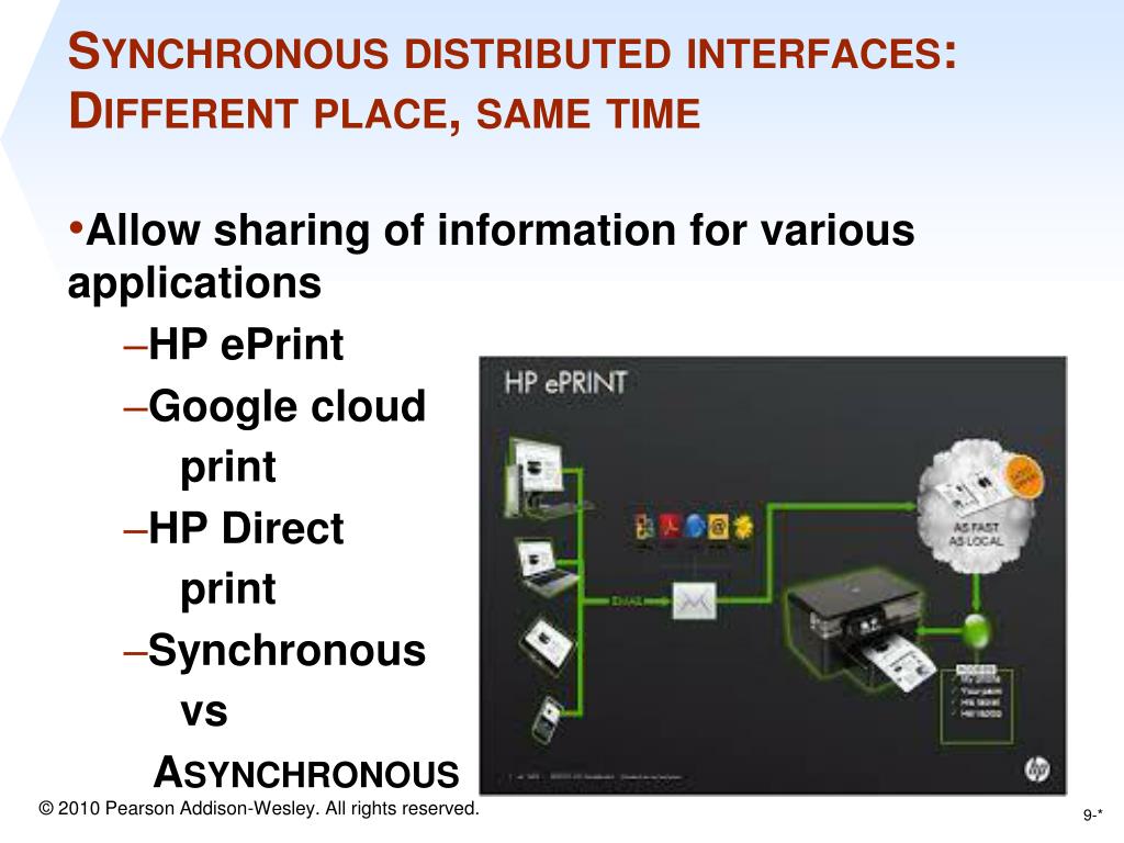 Allow sharing of information for various applications HP ePrint Google cloud print HP Direct print Synchronous vs Asynchronous Synchronous distributed interfaces:Different place, same time 9-*