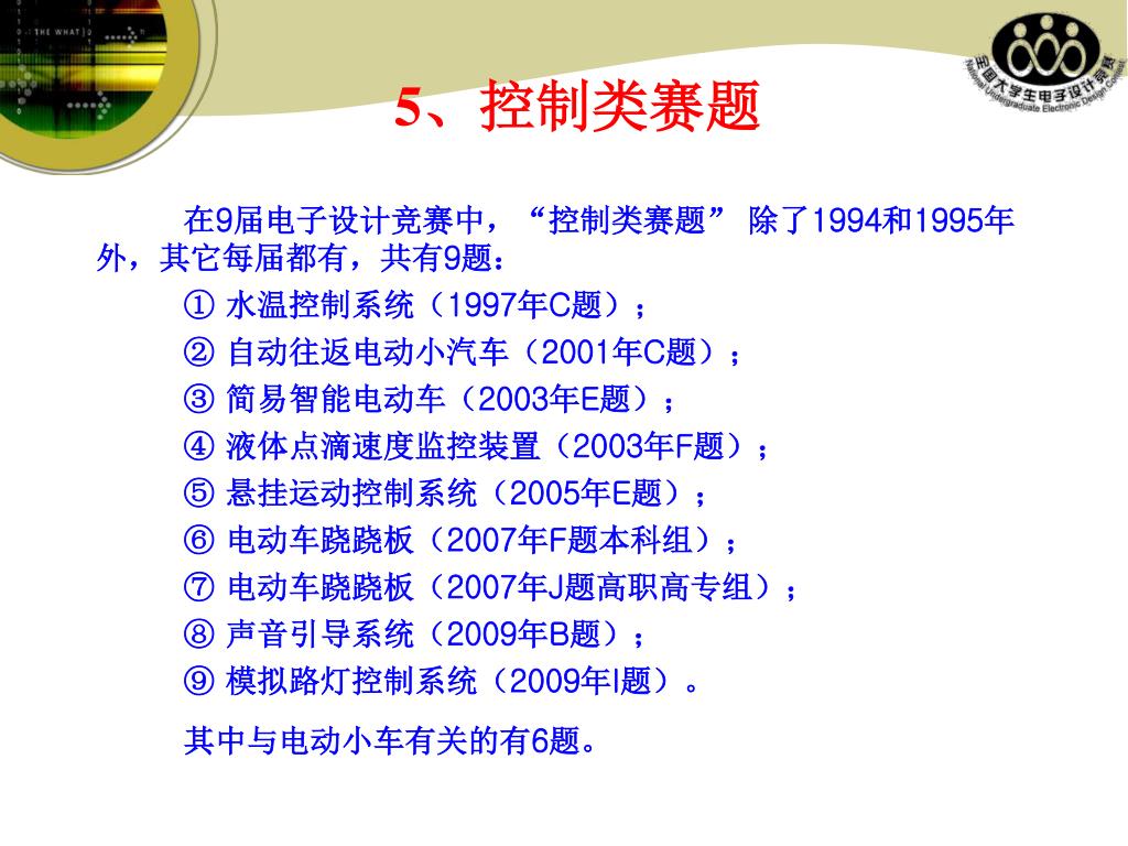 5、控制类赛题 在9届电子设计竞赛中,“控制类赛题” 除了1994和1995年外,其它每届都有,共有9题: ① 水温控制系统(1997年C题); ② 自动往返电动小汽车(2001年C题); ③ 简易智能电动车(2003年E题); ④ 液体点滴速度监控装置(2003年F题); ⑤ 悬挂运动控制系统(2005年E题); ⑥ 电动车跷跷板(2007年F题本科组); ⑦ 电动车跷跷板(2007年J题高职高专组); ⑧ 声音引导系统(2009年B题); ⑨ 模拟路灯控制系统(2009年I题)。 其中与电动小车有关的有6题。
