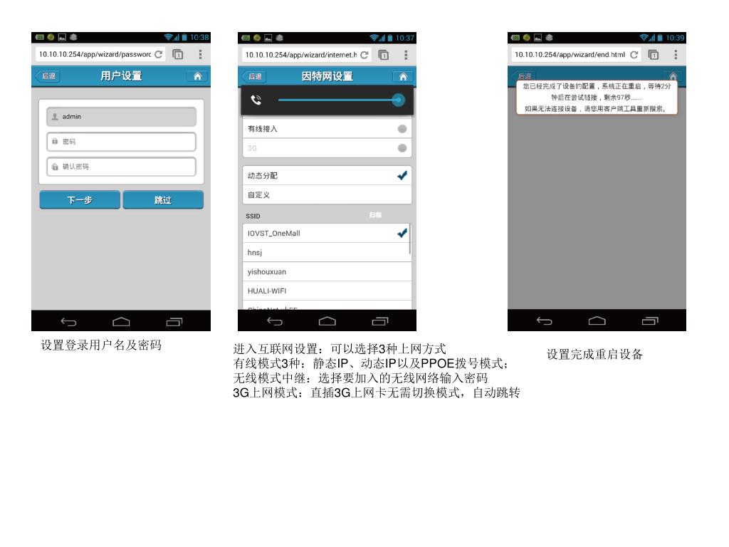 设置登录用户名及密码 进入互联网设置:可以选择3种上网方式 有线模式3种:静态IP、动态IP以及PPOE拨号模式; 无线模式中继:选择要加入的无线网络输入密码 3G上网模式:直插3G上网卡无需切换模式,自动跳转 设置完成重启设备