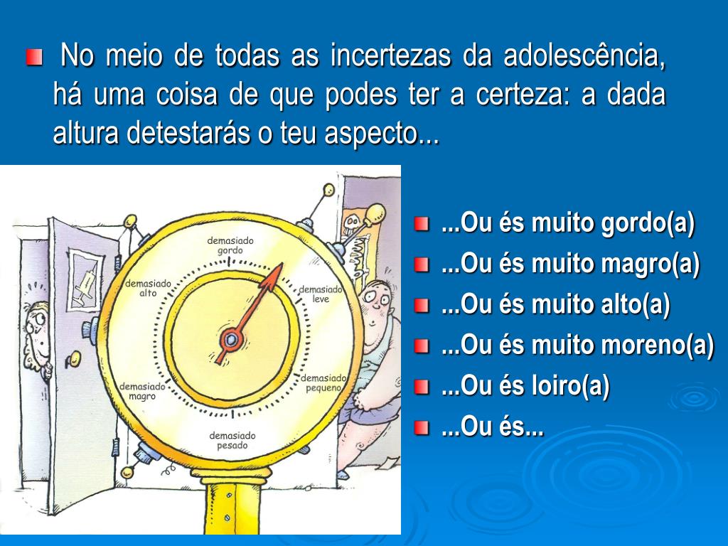 No meio de todas as incertezas da adolescência, há uma coisa de que podes ter a certeza: a dada altura detestarás o teu aspecto... ...Ou és muito gordo(a) ...Ou és muito magro(a) ...Ou és muito alto(a) ...Ou és muito moreno(a) ...Ou és loiro(a) ...Ou és...