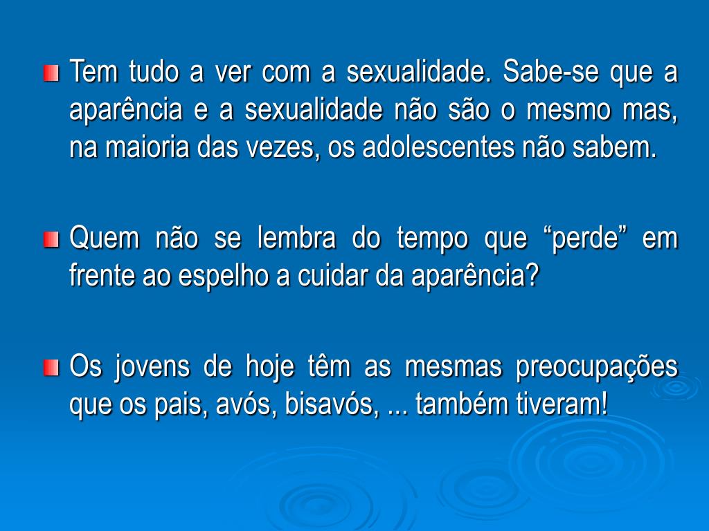 Tem tudo a ver com a sexualidade. Sabe-se que a aparência e a sexualidade não são o mesmo mas, na maioria das vezes, os adolescentes não sabem. Quem não se lembra do tempo que “perde” em frente ao espelho a cuidar da aparência? Os jovens de hoje têm as mesmas preocupações que os pais, avós, bisavós, ... também tiveram!