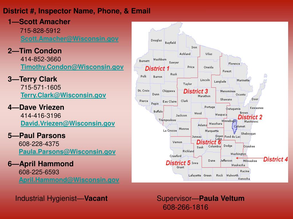 District #, Inspector Name, Phone, & Email 1—Scott Amacher715-828-5912Scott.Amacher@Wisconsin.gov2—Tim Condon 414-852-3660 Timothy.Condon@Wisconsin.gov3—Terry Clark715-571-1605Terry.Clark@Wisconsin.gov4—Dave Vriezen414-416-3196David.Vriezen@Wisconsin.gov5—Paul Parsons608-228-4375 Paula.Parsons@Wisconsin.gov6—April Hammond 608-225-6593April.Hammond@Wisconsin.gov Industrial Hygienist—Vacant Supervisor—Paula Veltum608-266-1816