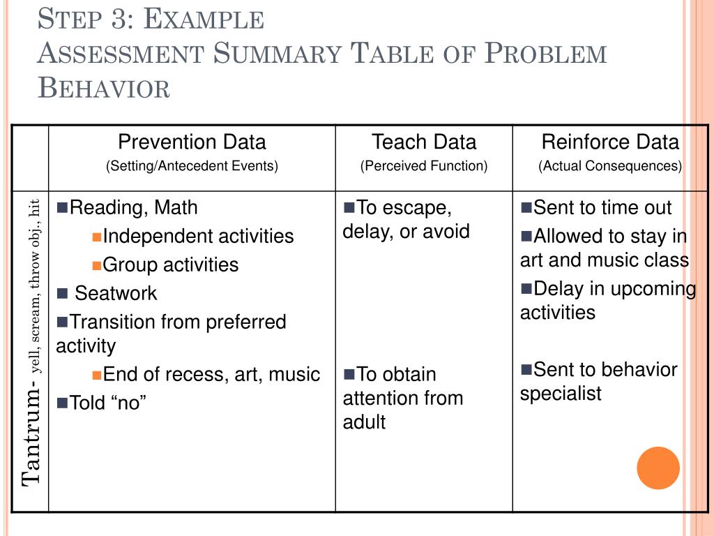 Step 3: ExampleAssessment Summary Table of Problem Behavior Tantrum- yell, scream, throw obj., hit