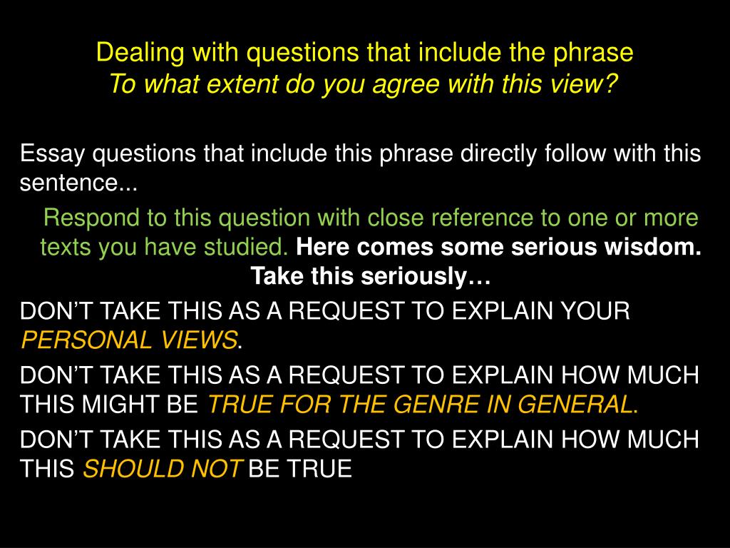 Dealing with questions that include the phrase To what extent do you agree with this view? Essay questions that include this phrase directly follow with this sentence... Respond to this question with close reference to one or more texts you have studied.Here comes some serious wisdom. Take this seriously… DON’T TAKE THIS AS A REQUEST TO EXPLAIN YOUR PERSONAL VIEWS. DON’T TAKE THIS AS A REQUEST TO EXPLAIN HOW MUCH THIS MIGHT BE TRUE FOR THE GENREIN GENERAL. DON’T TAKE THIS AS A REQUEST TO EXPLAIN HOW MUCH THIS SHOULD NOT BE TRUE