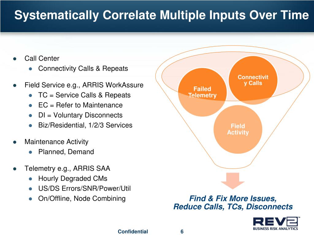 MSO Case Study Parameters of Blind Comparison Study by Maintenance Department • 1,000,000 subs in Region | 35,000 HFC miles | 180 technicians | 15 supervisors | 4 managers | 1 director • 7,500 nodes in 3,000 DOCSIS Serving Groups (combinations of nodes) Hypothesis • [operating cost without Automation – operating cost with Automation] = Quantifiable Savings Study Groups • Control Group = Business as Usual (BAU) • Test Group =RiskView (RV) Outage Risk Analytics Goals • Minimize downtime of the “operating assets” To enhance customer satisfactionwhile lowering care and support costs • Monitor maintenance activity for its effectiveness Earlier detection helps in solving chronic problems thereby reducing disconnects Departments Impacted by Control Group Discovered Issues • Service Department focuses on Non-Area Issues • Maintenance Department focuses on Area issues Confidential 5
