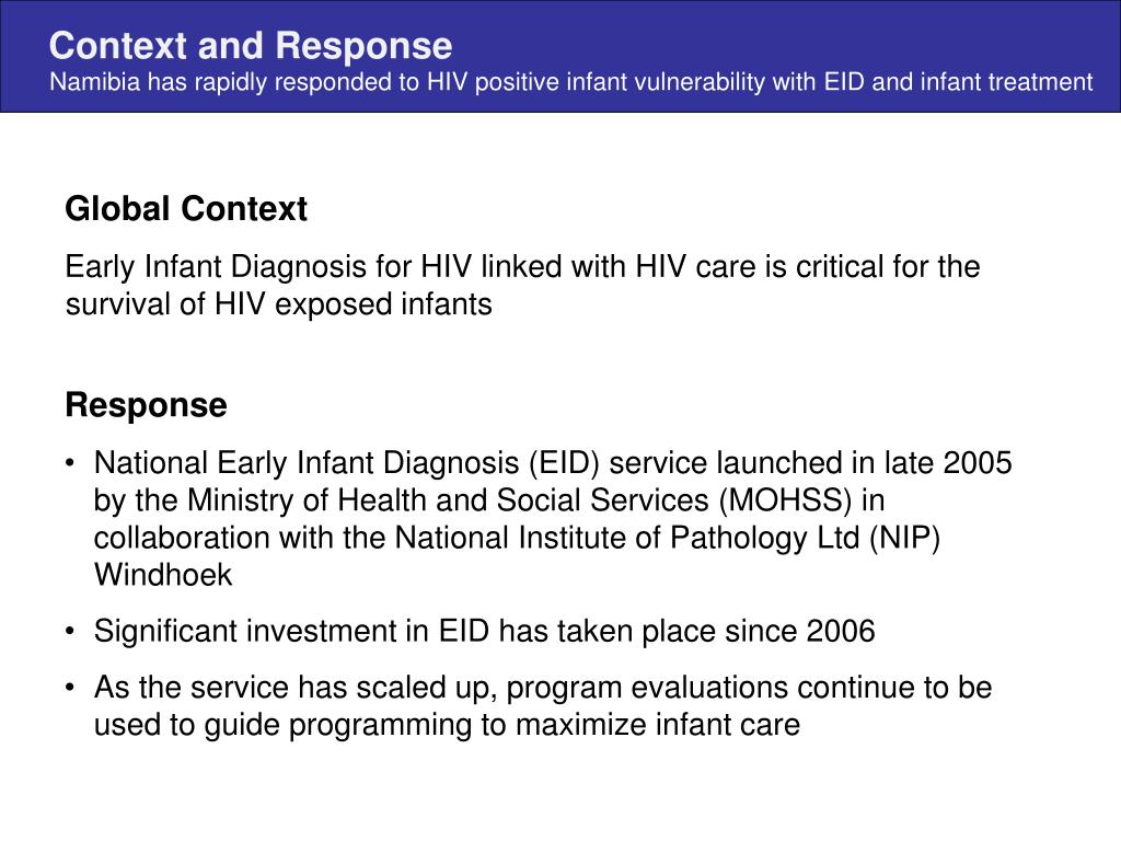 Namibia has rapidly responded to HIV positive infant vulnerability with EID and infant treatment Global Context Early Infant Diagnosis for HIV linked with HIV care is critical for the survival of HIV exposed infants Context and Response • Response • National Early Infant Diagnosis (EID) service launched in late 2005 bythe Ministry of Health and Social Services (MOHSS) in collaboration with the National Institute of Pathology Ltd (NIP) Windhoek • Significant investment in EID has taken place since 2006 • As the service has scaled up, program evaluations continue to be used to guide programming to maximize infant care