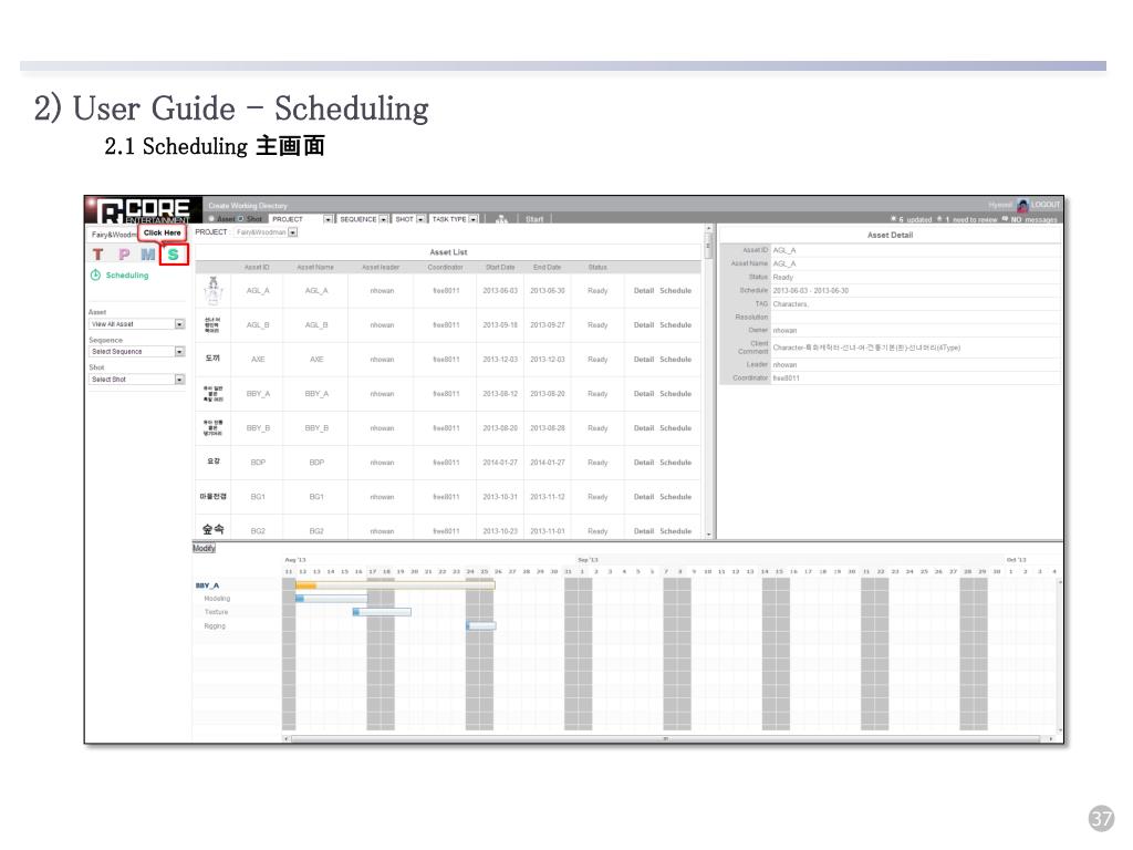 2) User Guide - Scheduling 2.4 [Scheduling]>[Shot] 先选择项目 > Asset 目录选择 > 顺序选择. 可确认Admin上所登录的顺序内容。 可以以甘特图确认日程。 1 2 3