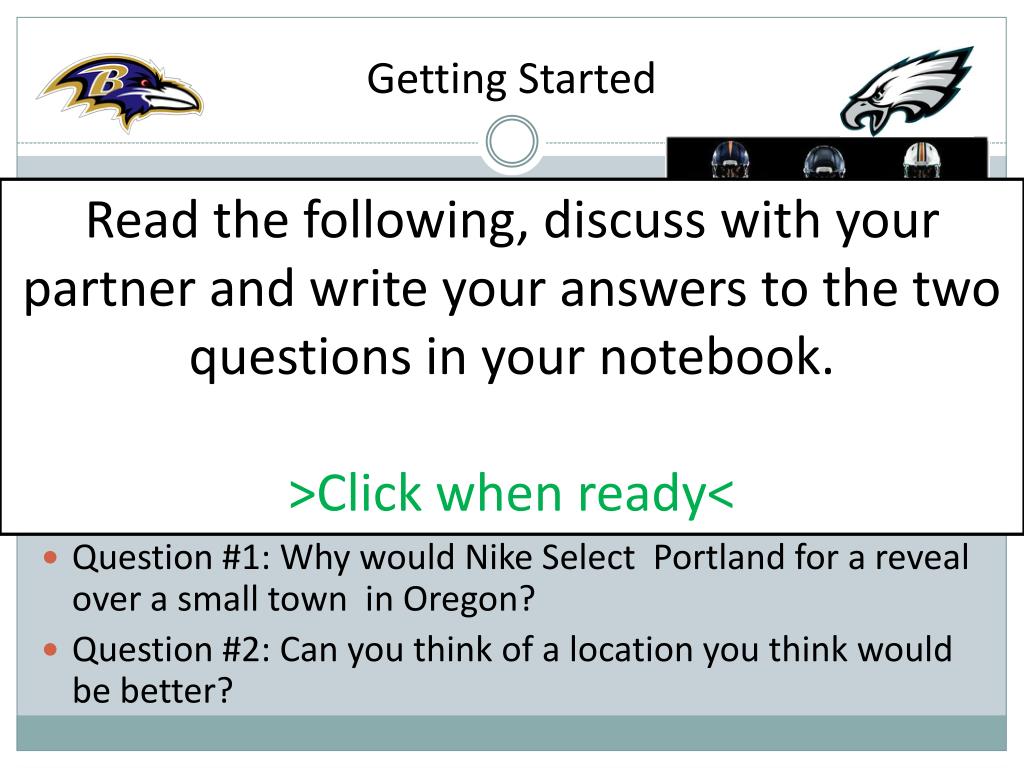 Getting Started Who here is a Fan of NFL Football? This past season NFL jerseys switched manufacturers. While they had been made by Reebok before, Nike has taken over. Nike revealed their new jerseys in Portland, Oregon, a major city on the west coast Question #1: Why would Nike Select Portland for a reveal over a small town in Oregon? Question #2: Can you think of a location you think would be better? Read the following, discuss with your partner and write your answers to the two questions in your notebook. >Click when ready<