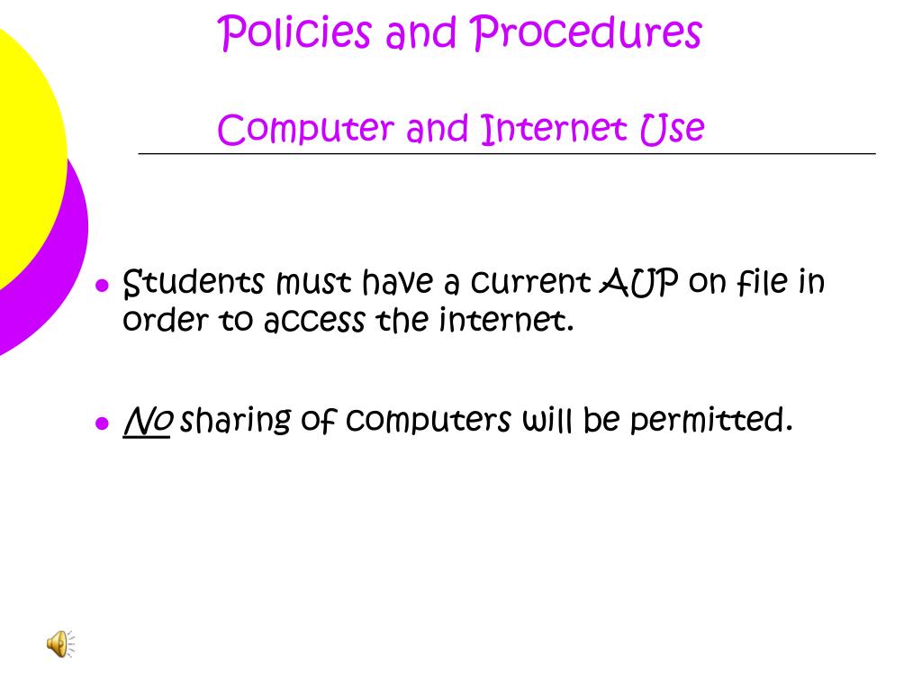 Policies and ProceduresComputer and Internet Use • Students must have a current AUP on file in order to access the internet. • No sharing of computers will be permitted.