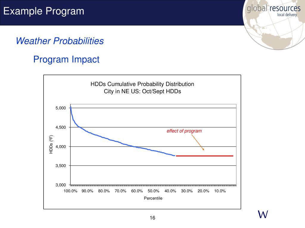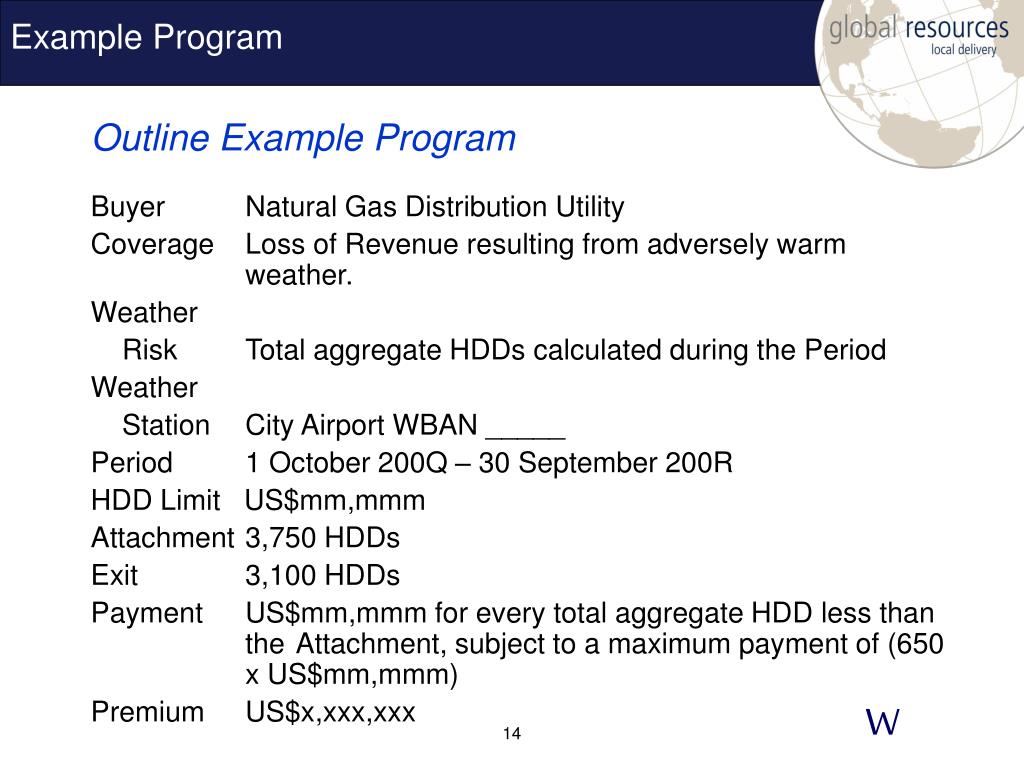 Example Program Outline Example Program Buyer Natural Gas Distribution Utility Coverage Loss of Revenue resulting from adversely warm weather. Weather Risk Total aggregate HDDs calculated during the Period Weather Station City Airport WBAN _____ Period 1 October 200Q – 30 September 200R HDD Limit US$mm,mmm Attachment 3,750 HDDs Exit 3,100 HDDs Payment US$mm,mmm for every total aggregate HDD less than the Attachment, subject to a maximum payment of (650 x US$mm,mmm) Premium US$x,xxx,xxx