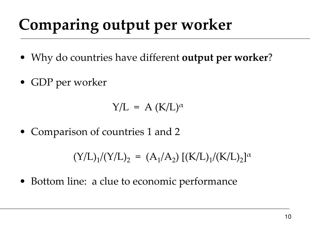 Comparing output per worker • Why do countries have different output per worker? • GDP per worker Y/L = A (K/L)α • Comparison of countries 1 and 2 • (Y/L)1/(Y/L)2 = (A1/A2) [(K/L)1/(K/L)2]α • Bottom line: a clue to economic performance