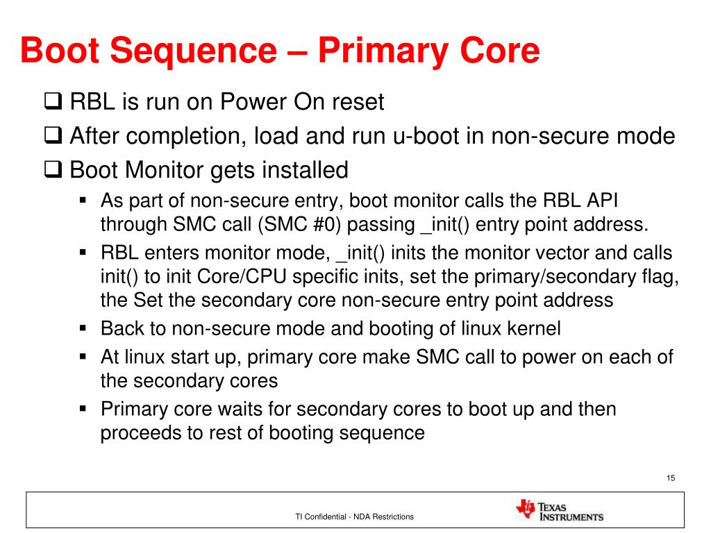 Boot Sequence – Primary Core • RBL is run on Power On reset • After completion, load and run u-boot in non-secure mode • Boot Monitor gets installed • As part of non-secure entry, boot monitor calls the RBL API through SMC call (SMC #0) passing _init() entry point address. • RBL enters monitor mode, _init() inits the monitor vector and calls init() to init Core/CPU specific inits, set the primary/secondary flag, the Set the secondary core non-secure entry point address • Back to non-secure mode and booting of linux kernel • At linux start up, primary core make SMC call to power on each of the secondary cores • Primary core waits for secondary cores to boot up and then proceeds to rest of booting sequence TI Confidential - NDA Restrictions