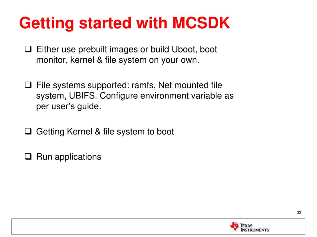 Getting started with MCSDK • Either use prebuilt images or build Uboot, boot monitor, kernel & file system on your own. • File systems supported: ramfs, Net mounted file system, UBIFS. Configure environment variable as per user’s guide. • Getting Kernel & file system to boot • Run applications