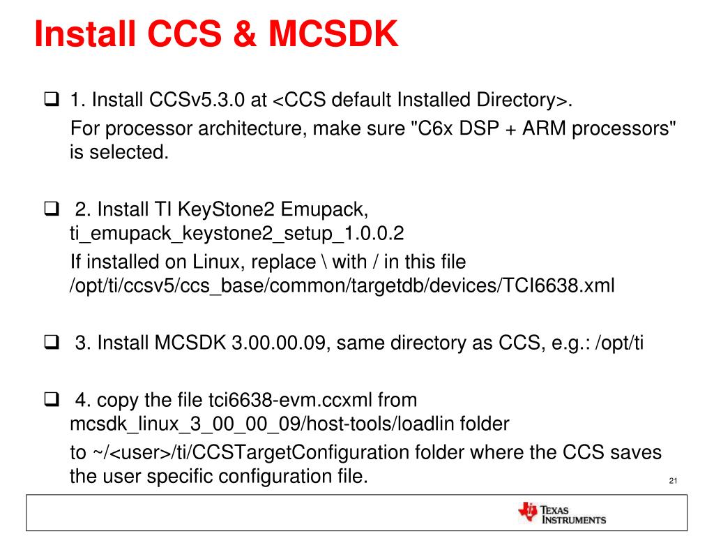 Install CCS & MCSDK • 1. Install CCSv5.3.0 at <CCS default Installed Directory>. For processor architecture, make sure "C6x DSP + ARM processors" is selected. • 2. Install TI KeyStone2 Emupack, ti_emupack_keystone2_setup_1.0.0.2 If installed on Linux, replace \ with / in this file /opt/ti/ccsv5/ccs_base/common/targetdb/devices/TCI6638.xml • 3. Install MCSDK 3.00.00.09, same directory as CCS, e.g.: /opt/ti • 4. copy the file tci6638-evm.ccxml from mcsdk_linux_3_00_00_09/host-tools/loadlin folder to ~/<user>/ti/CCSTargetConfiguration folder where the CCS saves the user specific configuration file.