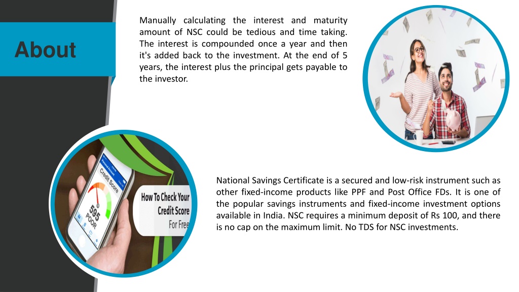 Manually calculating the interest and maturity amount of NSC could be tedious and time taking. The interest is compounded once a year and then it's added back to the investment. At the end of 5 years, the interest plus the principal gets payable to the investor. About National Savings Certificate is a secured and low-risk instrument such as other fixed-income products like PPF and Post Office FDs. It is one of the popular savings instruments and fixed-income investment options available in India. NSC requires a minimum deposit of Rs 100, and there is no cap on the maximum limit. No TDS for NSC investments.